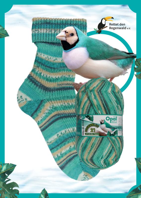 Opal Rainforest 21 is a self-patterning range of 4 ply sock yarn in an array of colourful shades. Opal donate a proportion of proceeds from the sale of this yarn to organisations that save the rainforests.