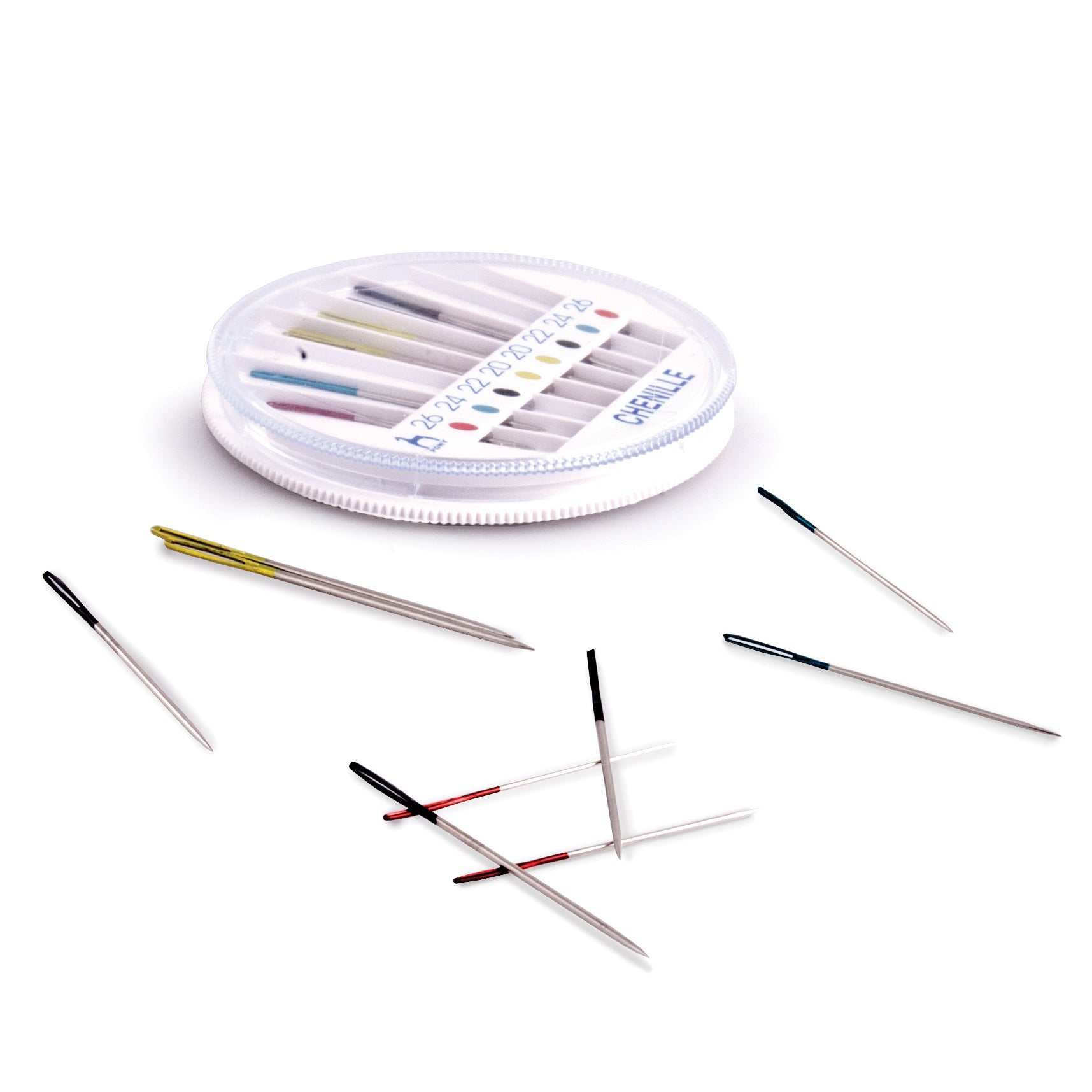 Helps to find needles easily. The needles are colour-coded according to size. 24 per compact.