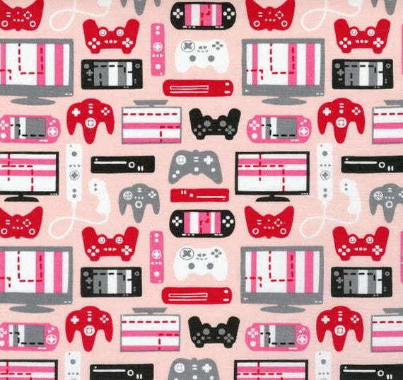 Fun and pink gaming themed design from Elizabeth Silver and Camelot Fabrics.