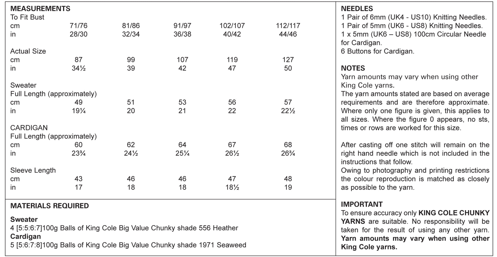 Pattern Details for King Cole 4703 Sweater and Cardigan in Big Value Chunky