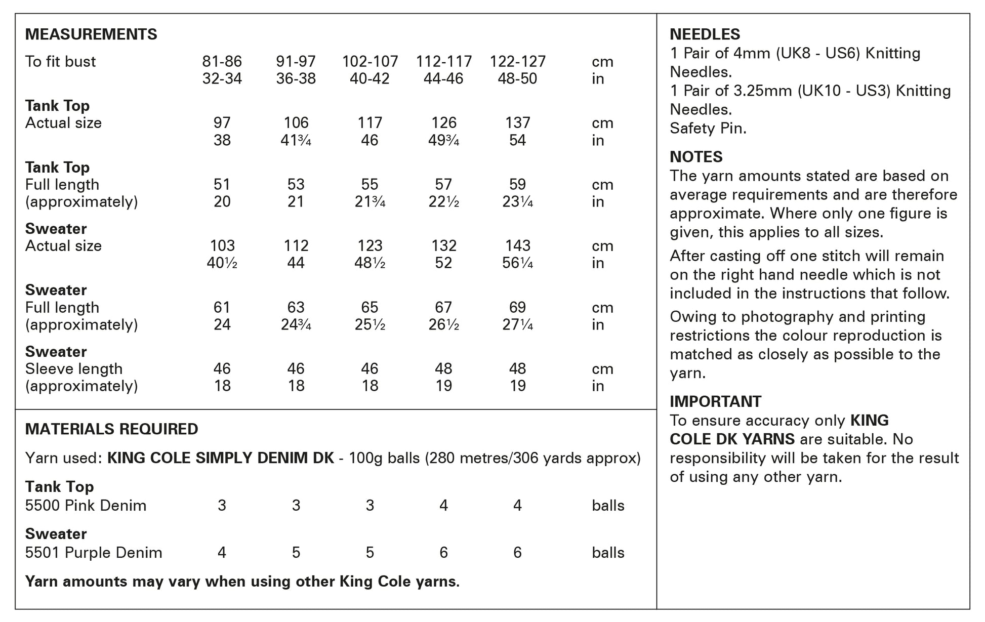 Pattern Details for King Cole 6156 Tank Top and Sweater in Simply Denim DK (leaflet)