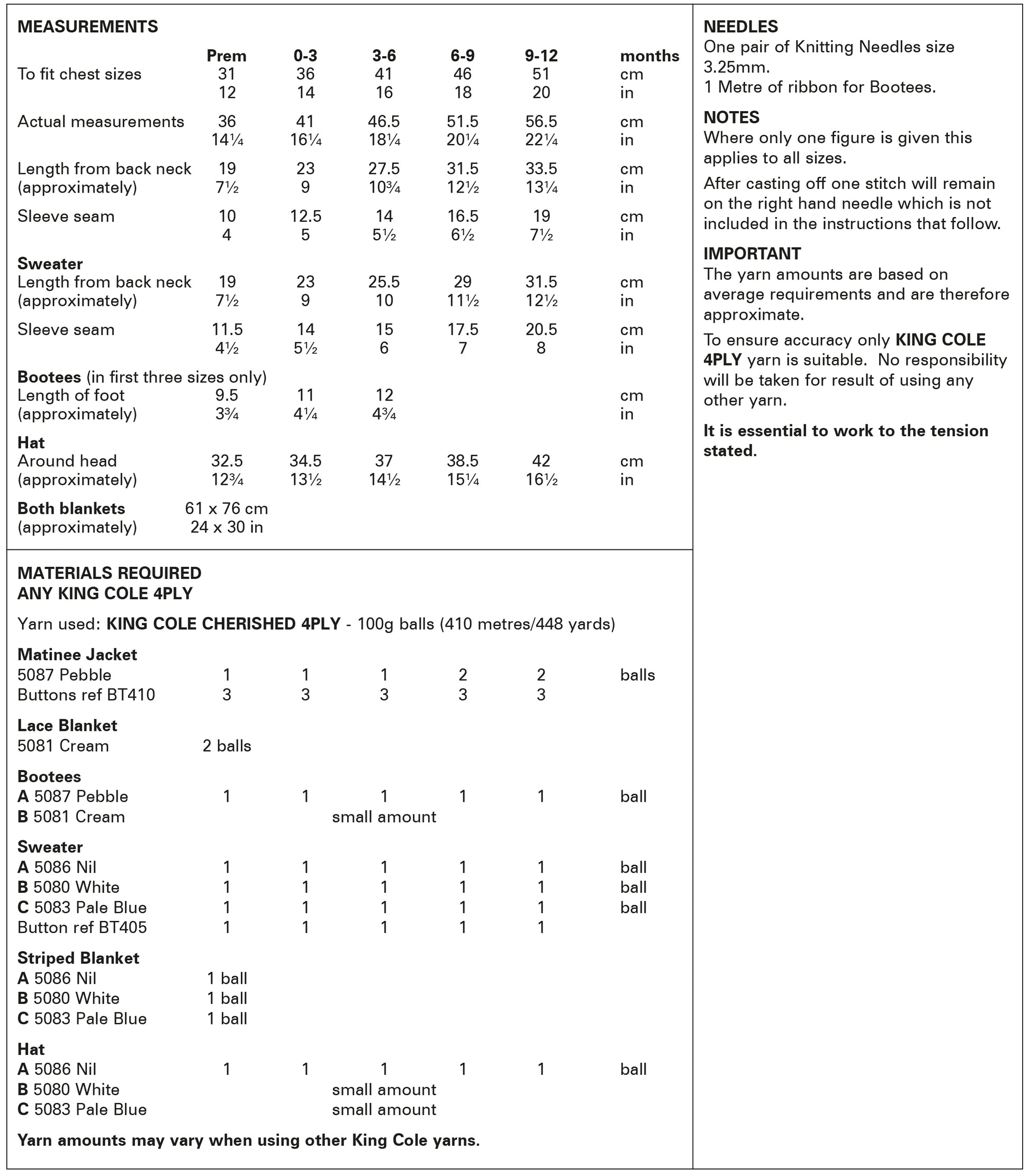 Pattern Details for King Cole 6169 Blankets, Matinee Jacket, Sweater, Bootees and Hat in Cherished 4 Ply
