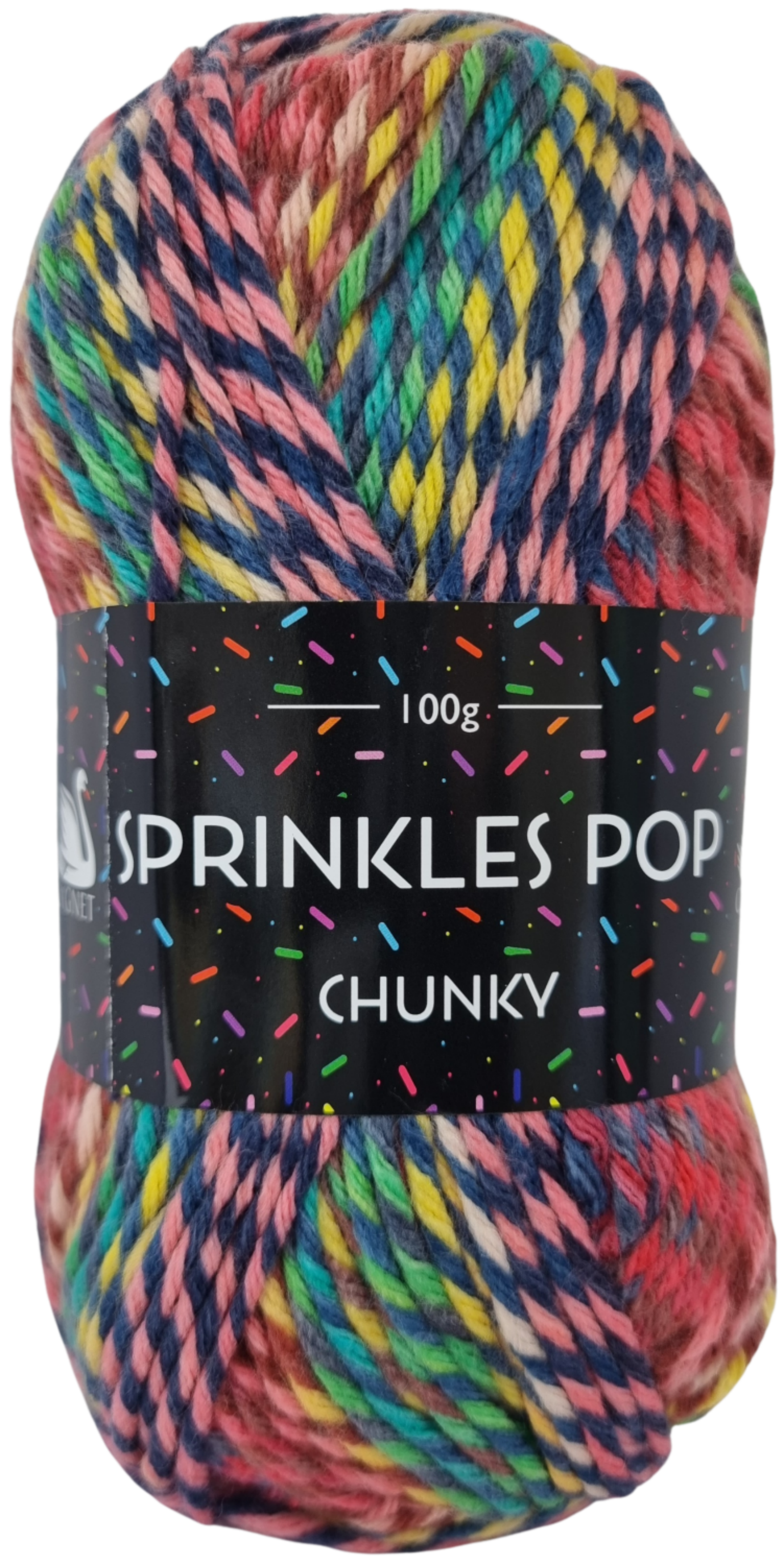 Sprinkles Pop is a fun printed chunky yarn with two ends cleverly twisted together to create a tweedy self-striping effect. With soft colour changes throughout the stripes gives fancy colour results in your creations. Available in 8 bright shades, this yarn lends itself well to bulky, quick knit projects with a pop of colour!