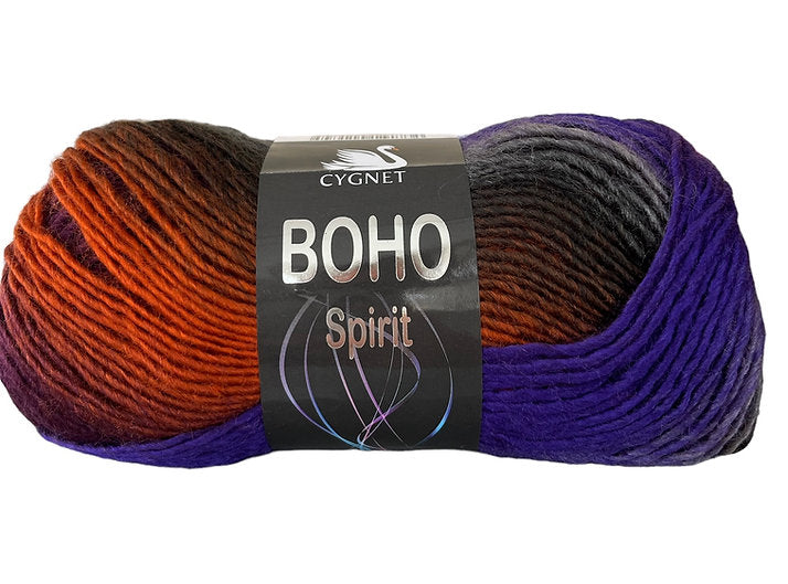 Boho Spirit is a fabulously soft, variegated roving yarn. Available in an array of incredible shades, this falls somewhere between double knit and aran weight. Due to the loftiness of the yarn, it is incredibly soft and versatile and works well knitted or crocheted and results in a soft garment with a beautiful subtle sheen.